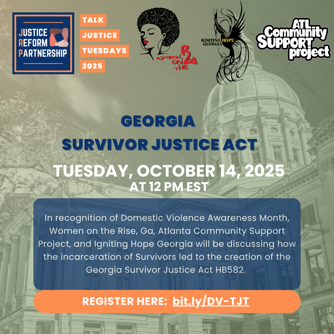 As part of the Georgia Justice Reform Partnership's (JRP) Talk Justice Tuesdays series and in honor of Domestic Violence Awareness month, Atlanta Community Support Project will be co-hosting, alongside Women on the Rise, Ga and Igniting Hope Georgia, a discussion about the work to free incarcerated survivors and the recent passage of the Georgia Survivor Justice Act, HB 582.